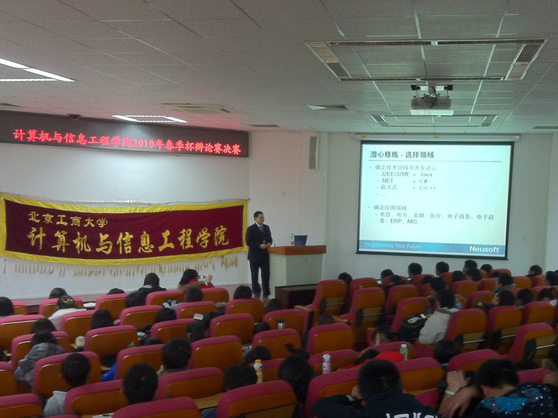 首先,董老師先做了一個幽默的自我介紹,同時也向同學們介紹了東軟集團。東軟集團是一家以軟件技術為核心,通過軟件與服務的結合,軟件與制造的結合,技術與行業管理能力的結合,提供行業解決方案和產品工程解決方案以及相關軟件產品、平臺及服務的公司。它所涵蓋的領域包括:電信、電力、金融、政府(社會保障、財政、稅務、公共安全、國土資源、海洋、質量監督檢驗檢疫、工商、知識產權等)以及制造業與商貿流通業、醫療衛生、教育、交通等各個行業,是我國最大的IT解決方案與服務供應商,同時也是我國數一數二的軟件公司。