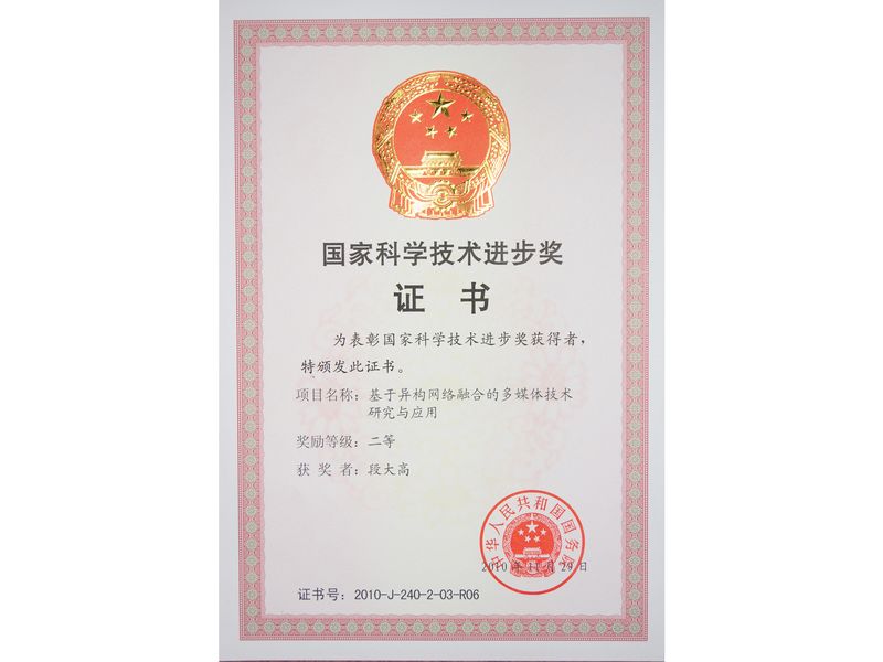 1月14日,2010年度國家科學技術獎勵大會在北京人民大會堂隆重舉行。我校教師段大高參與“基于異構網絡融合的多媒體技術研究與應用”項目獲得了2010年度國家科學技術進步獎二等獎。