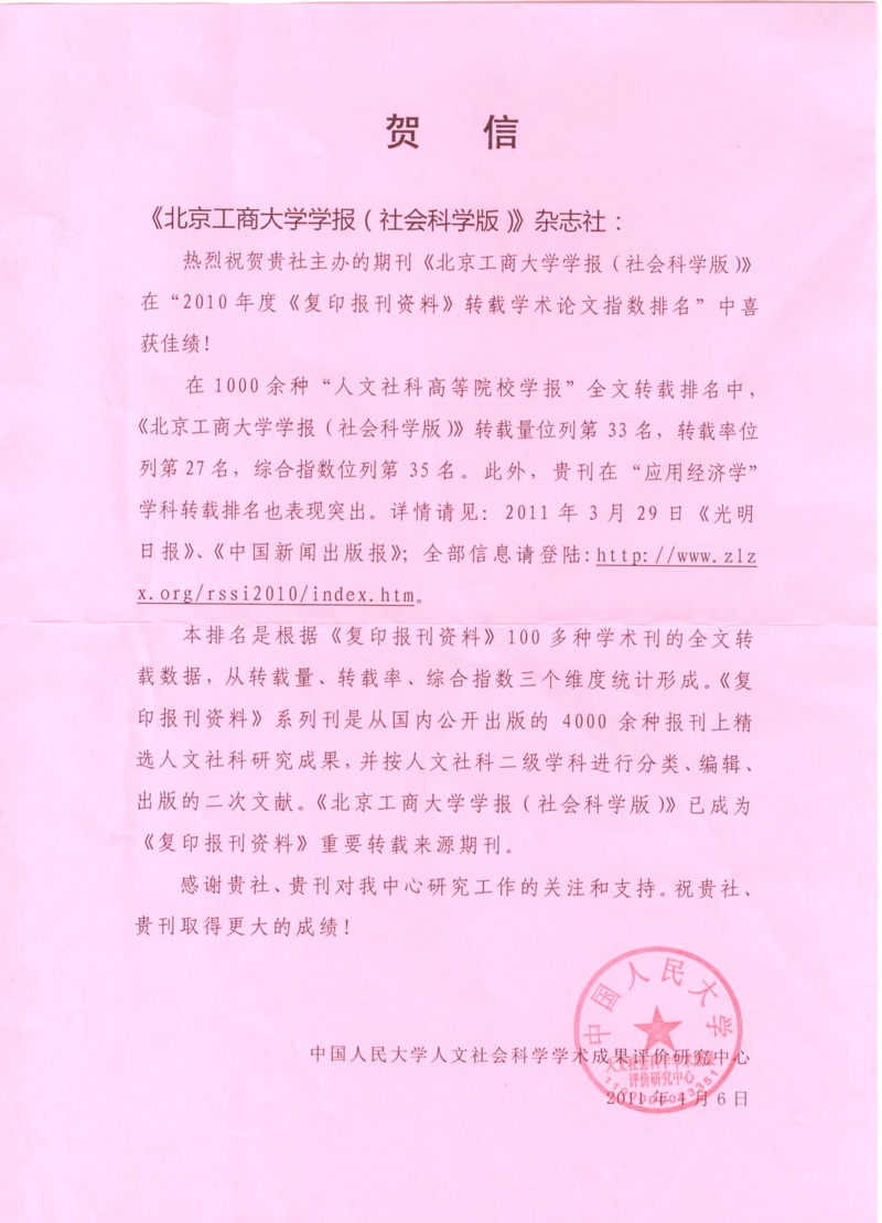 近日,《北京工商大學學報(社會科學版)》主編、副校長李朝鮮收到由中國人民大學人文社會科學學術成果評價研究中心發來的賀信,祝賀《北京工商大學學報(社會科學版)》在“2010年度《復印報刊資料》轉載學術論文指數排名”中喜獲佳績。