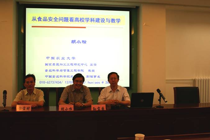同時(shí),胡小松教授又以親身經(jīng)歷為大家傳授他如何將在食品安全方面的專業(yè)知識(shí)運(yùn)用到教學(xué)工作中。首先,通過(guò)編寫《食品安全與飲食》教材,將現(xiàn)有的食品安全問(wèn)題進(jìn)行總結(jié),將其歸結(jié)為農(nóng)產(chǎn)品生產(chǎn)過(guò)程、食品加工過(guò)程和消費(fèi)過(guò)程三個(gè)發(fā)生時(shí)段,從而使學(xué)生更容易理解。其次,通過(guò)案例教學(xué)的方法,對(duì)食品安全法規(guī)的發(fā)展歷史、食品安全追溯體系的建立過(guò)程、引發(fā)全球恐慌的食品安全大事件、菜籃子工程、中國(guó)居民營(yíng)養(yǎng)行動(dòng)計(jì)劃的制定等經(jīng)典實(shí)例的列舉,使學(xué)生帶著問(wèn)題去對(duì)食品安全問(wèn)題進(jìn)行深入思考和分析。再次,結(jié)合中國(guó)農(nóng)業(yè)大學(xué)在食品質(zhì)量與安全學(xué)科建設(shè)的實(shí)際經(jīng)驗(yàn),胡教授認(rèn)為專業(yè)的建設(shè)與教學(xué)一定要突出特色,將有限的力量集中投入到一點(diǎn)上才能做出更大的成績(jī),并且對(duì)教授和副教授承擔(dān)的課程范圍進(jìn)行了限制和規(guī)定。最后,胡教授自己的團(tuán)隊(duì)在教學(xué)和科研方面承擔(dān)的任務(wù)和取得的顯著成績(jī),他所領(lǐng)導(dǎo)的國(guó)家果蔬加工工程研究中心在果蔬產(chǎn)品的質(zhì)量安全、功能營(yíng)養(yǎng)以及非熱加工裝備研究方面處于國(guó)內(nèi)領(lǐng)先地位,并且被列為本科生URP計(jì)劃創(chuàng)新基地,每年有40余名本科生進(jìn)入實(shí)驗(yàn)室參與研究工作,取得了很好的教學(xué)成果。