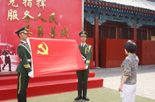 表演結束后,師生參觀了官兵們的宿舍,整齊劃一的內務環境,使同學們在感嘆的同時也感到了自身的不足。官兵們還帶領大家參觀了國旗護衛隊的榮譽室,不大的屋內掛滿了官兵們得到的榮譽旗幟。在講解員認真細致的講解之后,師生對國旗護衛隊獲得的榮譽及成就有了深入的了解,也使我們對國旗護衛隊有了更深的敬意。參觀結束后,師生與官兵們展開了贈書的活動,文四英老師將捐贈的黨史書籍親手交到了官兵們的手上。隨后,她帶領全院的黨員和預備黨員,在國旗護衛隊手持的黨旗下進行了入黨宣誓的儀式,為共產主義奮斗終身!”入黨誓言聲聲回響。