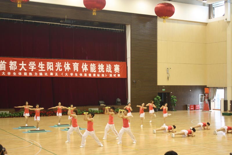 5月28日,2011年首都大學(xué)生陽光體育體能挑戰(zhàn)賽在文體館舉行。來自清華大學(xué)、北京師范大學(xué)、北京工商大學(xué)等15所高校的17支代表隊(duì)參加了包括熱力操、健康標(biāo)準(zhǔn)測(cè)試、及團(tuán)體名次的爭奪。北京市教委體育衛(wèi)生與藝術(shù)教育處處長王東江、北京市大學(xué)生體育協(xié)會(huì)主席杜松彭、北京工商大學(xué)副校長呼文亮、北京市農(nóng)學(xué)院黨委副書記高東、北京工商大學(xué)體育與藝術(shù)部主任顧紅及十幾位參賽院校的體育部主任到場觀看了本次大賽,并為獲獎(jiǎng)團(tuán)體頒獎(jiǎng)。