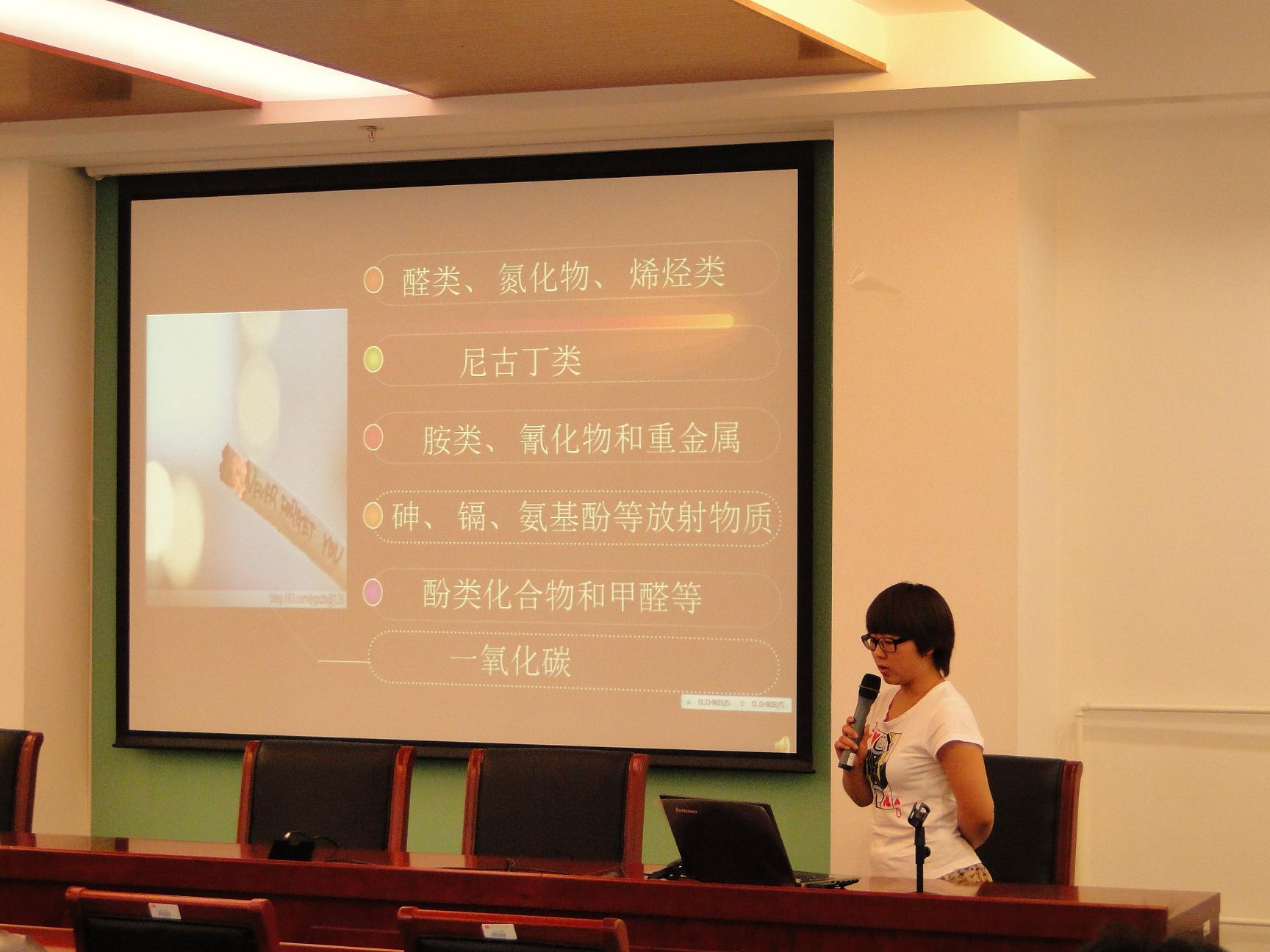 研究生會副主席馬莉同學對世界無煙日的前期宣傳工作情況進行了簡要介紹,并用幻燈片的形式展示了關于無煙日的由來、歷年主題、吸煙對人體的危害等內容。來自商學院、經濟學院、食品學院、計信學院、法學院的研究生們分別從各自專業角度,以吸煙收益模型、控煙的經濟學手段、煙霧化學成分分析及危害、煙霧自動監測報警技術、控煙法律效力和執行方式等作為主題,通過生動的圖片、直觀的模型、詳實的分析,多視角全方位地向大家介紹了如何看待吸煙問題,并提出了以自己的調查分析為基礎提出了可行性解決辦法。