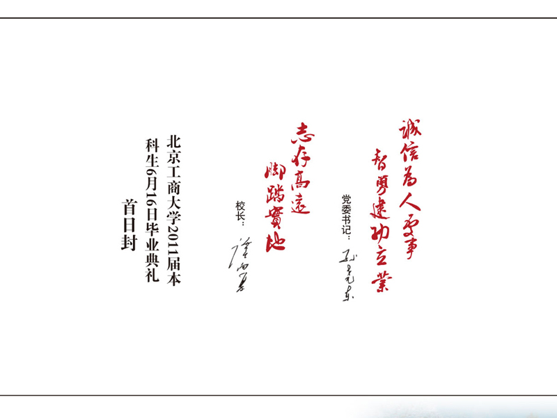 首日封正面由學校圖書館遠景、09年國慶紀念郵票、校徽、紀念郵戳幾部分組成,充分展現2011屆畢業生豐富多彩的大學生活。首日封背面是學校黨委書記孫堯東和校長譚向勇的題詞,分別為“誠信為人處事、智勇建功立業”和“志存高遠、腳踏實地”,這也是學校對所有畢業生的期待和祝福。