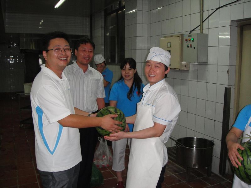 他們首先來到了阜成路校區東區食堂和清真餐廳。食堂操作間的溫度很高,而且沒有空調,工作人員克服種種困難,始終堅守崗位。兩位副處長和食堂的工作人員親切交談,詢問他們近期的工作和生活狀況,并且向食堂的工作人員送去了防暑降溫的慰問品。食堂員工們表示一定會克服困難,盡自己所能為師生們提供滿意的服務。他們隨后來到動力維修科,動力維修科的很多工作都是在戶外或樓層中進行的,在戶外高達36度的高溫下,從事體力勞動,對動力維修科的工作人員來說是極大地考驗。盧燦寬、尹寶星對動力維修科的工作人員在如此艱苦的工作環境下依舊努力工作表達了感謝之情。下午他們來到良鄉校區,看望車隊、良鄉食堂和公寓管理中心的工作人員,對后勤職工認真負責的工作態度表示肯定,對職工們冒著高溫忘我工作的奉獻精神表示了贊揚。