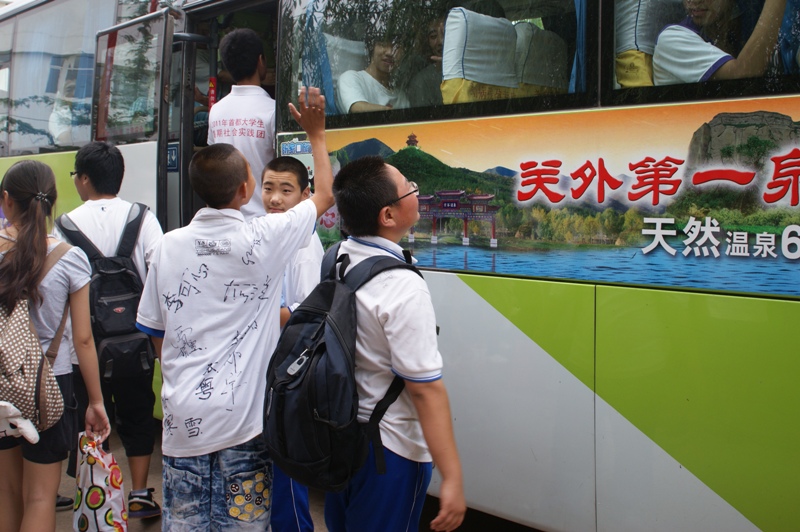 令人感動(dòng)的是,南召中學(xué)的同學(xué)們今早冒著小雨前來(lái)為我們實(shí)踐分團(tuán)送行。我們隨車(chē)返回,而他們緊追不舍,在車(chē)的背后望著我們愈行愈遠(yuǎn),直至消失車(chē)影。