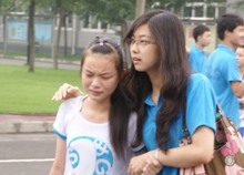 1115分,最后一天的課結束了,實踐分團成員們把自己班的孩子們送出教室,跟著他們一直走到了校門口。天空適時地飄起了小雨,在蒙蒙細雨中,孩子們和“小老師們”依依惜別,相互擁抱。孩子們一邊哭一邊揮手告別。