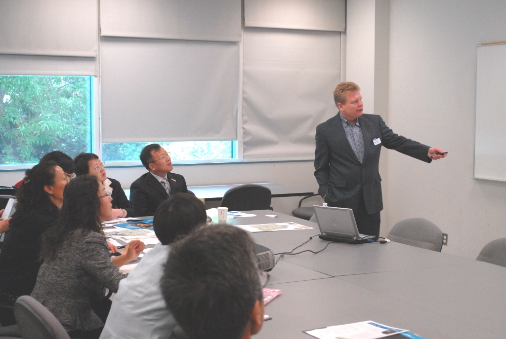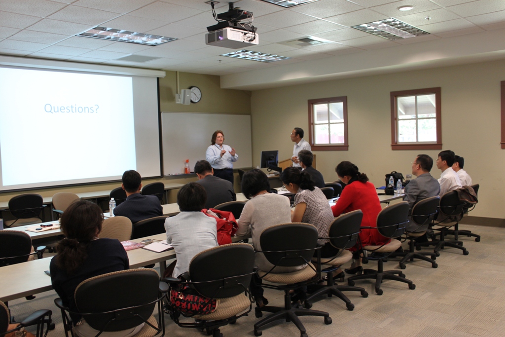 精彩的報(bào)告讓團(tuán)員們忘卻了疲勞,第二天又精神飽滿地聽(tīng)取了該校戴維斯分校人力資源部埃爾恩•湯普遜(Irene Horgan-Thompson)部長(zhǎng)關(guān)于福利待遇、崗位管理和發(fā)展的專題報(bào)告。該校可持續(xù)發(fā)展中心主任、國(guó)際著名政治學(xué)教授拉里•伯曼(Larry Berman)教授就美國(guó)現(xiàn)有的政治體制、高等教育體制和高等教育的層次構(gòu)成及辦學(xué)特色、現(xiàn)狀等問(wèn)題,做了全面系統(tǒng)的解讀,使培訓(xùn)團(tuán)成員全景式地了解到當(dāng)下美國(guó)的政治經(jīng)濟(jì)及高等教育狀況。團(tuán)員們珍惜每個(gè)學(xué)習(xí)機(jī)會(huì),課堂上踴躍提問(wèn),和教授們交流熱烈。