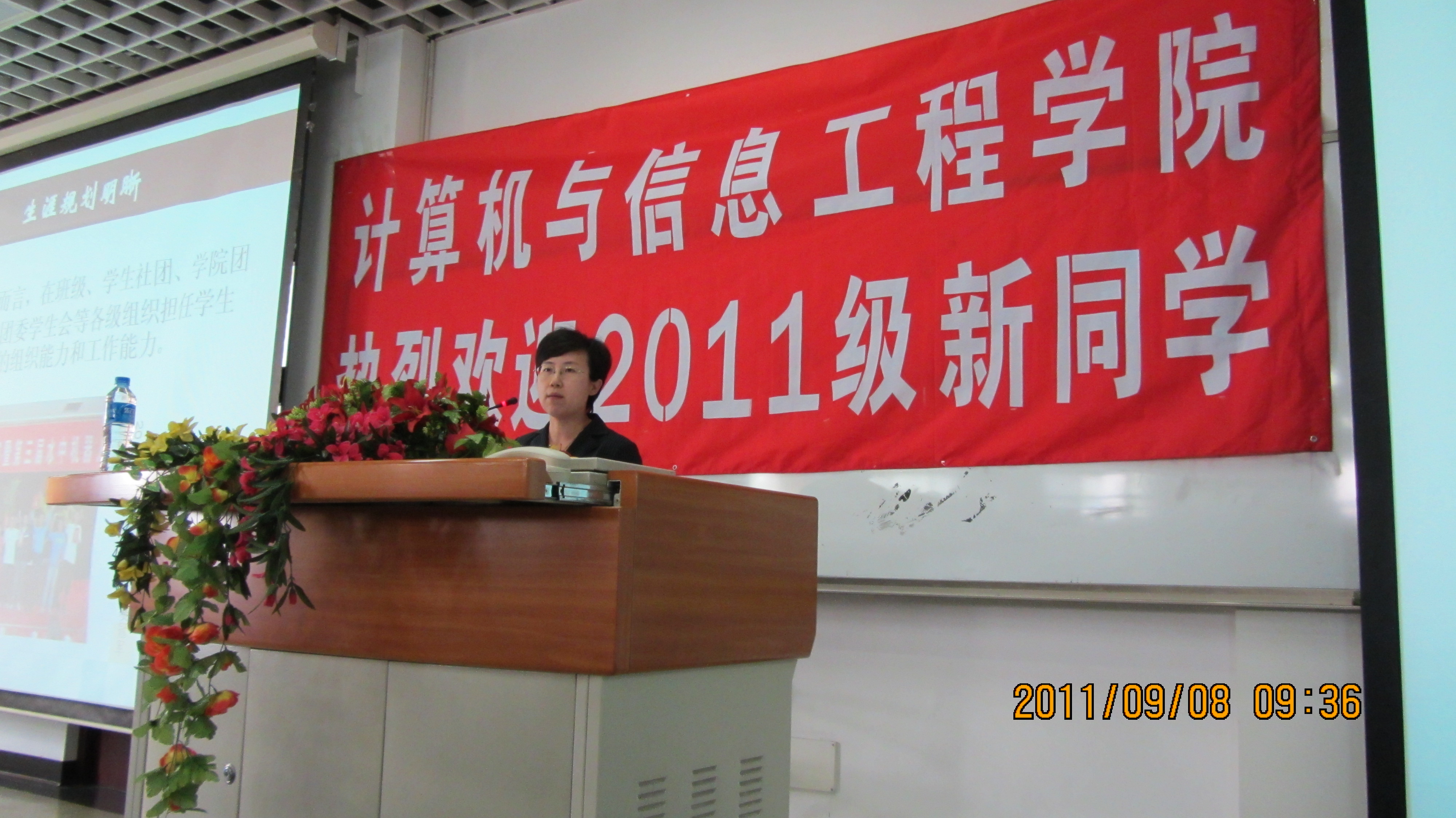 在會上,黨總支書記陳誼教授致開幕詞歡迎2011級新生,她針對為什么學、學什么、怎么學三個方面展開講話,強調了大學生要進行科學系統的職業生涯規劃,學習知識提升能力,精細規劃追求卓越,提升素質全面發展,要盡快熟悉計信學院這個大家庭,希望新生們在大學學習生活中腳踏實地,不斷提高培養創新實踐能力。受劉載文院長的委托,陳書記向新生介紹了學院的整體情況。教學副院長姜同強教授則就新生最關心的課程安排及學業規劃做詳細的說明,要求各位新生要努力學習專業知識,嚴格遵守校規校紀。黨總支副書記鄭喜姣老師也提出對學生提出了幾點期望,希望各位同學以成長成才為目標,全方面提升自己的綜合能力,增強自己的契約意識、進取意識和進取意識,成為對社會有用的棟梁之才。