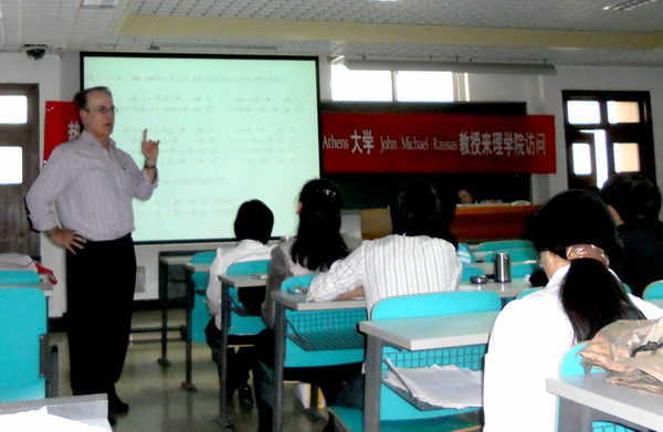 9月20日和21日下午,希臘數(shù)學(xué)家John Michael Rassias 和Vasso 來(lái)理學(xué)院講學(xué),在良鄉(xiāng)校區(qū)為理學(xué)院師生做了精彩報(bào)告,題目分別為 “The exterior Bitsapze-Ravrentjev problem for quarter elliptic-quarter hyperbolic equations in a double connected domain”和 “Mathematics in life”,陪同而來(lái)的北師大數(shù)學(xué)學(xué)院鄧冠鐵教授也為理學(xué)院的師生介紹了關(guān)于概率論與函數(shù)論相結(jié)合的最新科研成果。