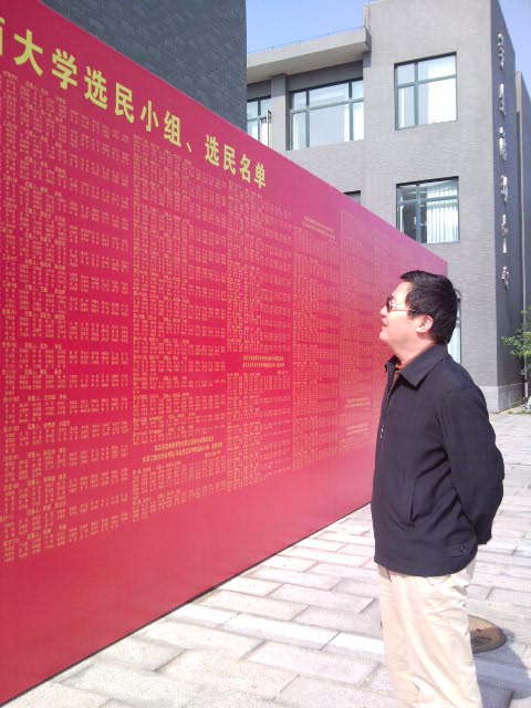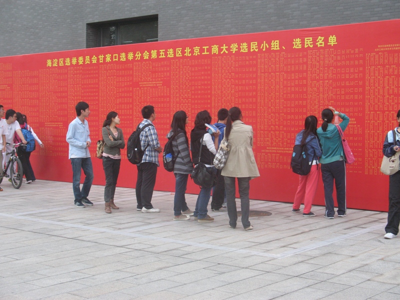 根據甘家口街道選舉分會安排,自10月13日開始,海淀區人大代表換屆選舉工作進入公布選民名單階段,工商大學選區嚴格按照計劃安排準時貼出了選民榜。為方便選民察看,選區共張貼了10處選民榜,分別在工商大學良鄉校區、阜成路校區東區、社區居委會(5處)、中國消費者報社、北方投資集團、白中社區。工商大學選區15421名選民被劃分為334個選民小組,選民榜除公布選民名單外,同時公布了選民小組的劃分和各小組召集人的名字。