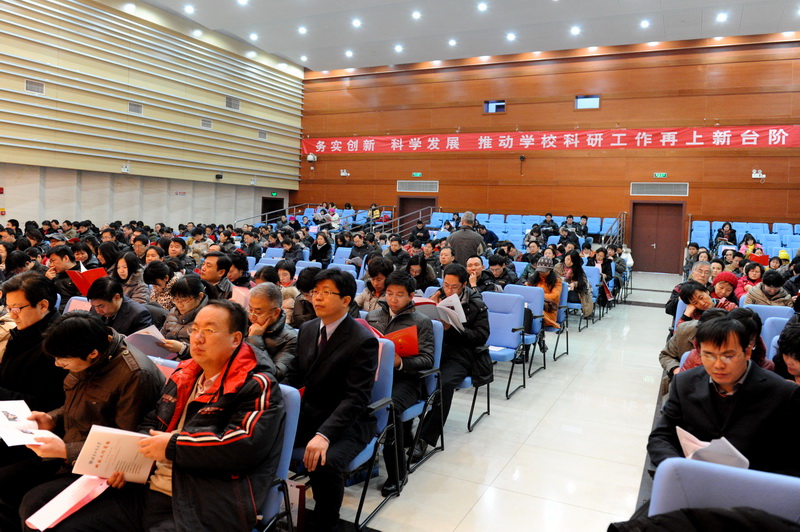 謝志華副校長作主題為《務(wù)實創(chuàng)新、科學(xué)發(fā)展、努力推動學(xué)校科研工作再上新臺階》的年度科研工作報告。報告總結(jié)了2011年學(xué)??蒲泄ぷ鞯闹饕煽儯嚎蒲许椖繑?shù)量和水平不斷提升;科研經(jīng)費持續(xù)增長、再創(chuàng)新高;科研成果數(shù)量、質(zhì)量明顯提高;科研優(yōu)勢特色進(jìn)一步突現(xiàn);科研成果轉(zhuǎn)化成效顯著;科研隊伍建設(shè)進(jìn)一步加強(qiáng);科協(xié)引領(lǐng)科技的示范效應(yīng)得到充分體現(xiàn);學(xué)術(shù)交流日益活躍。報告明確了2012年學(xué)校科研工作的思路與任務(wù),提出了2012年學(xué)??蒲泄ぷ鞯哪繕?biāo)與舉措:一是實施文化創(chuàng)新戰(zhàn)略,強(qiáng)化科研服務(wù)首都社會經(jīng)濟(jì)建設(shè);二是進(jìn)一步提高科研質(zhì)量和水平,完善科研評估體系;三是優(yōu)化科研資源配置,提高學(xué)??蒲匈Y源的使用效率;四是加大青年教師培育力度,快速提高青年教師的科研實力與水平;五是理順科研管理體制機(jī)制,不斷提高管理服務(wù)科研的效率。