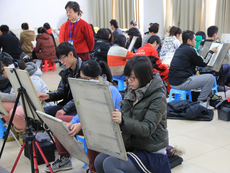不到八點(diǎn),考場(chǎng)的門口就已經(jīng)排了很長(zhǎng)的隊(duì)伍。他們拿著畫具,背著畫板,有的正在和朋友聊天,有的正在翻看著復(fù)習(xí)資料,而更多的則是陪家長(zhǎng)一起吃著簡(jiǎn)單的早餐。記者好奇的問了問一位考生手里畫具的重量,她說(shuō)道:“其實(shí)自己也沒有刻意的去稱過,但的確很重”。“從去年的暑假一直到現(xiàn)在,每天都會(huì)待在畫室里畫畫,很少有玩的時(shí)間”另一位考生如是說(shuō)道。八點(diǎn)三十分考生陸陸續(xù)續(xù)走進(jìn)了考場(chǎng)。站在考生隊(duì)伍兩旁的家長(zhǎng)們,也正在用祈盼的目光把自己的孩子送進(jìn)考場(chǎng)。記者走進(jìn)了家長(zhǎng)休息室,融入了家長(zhǎng)們的交談中,得知考生們大多數(shù)都是從去年暑假就開始他們的專業(yè)課學(xué)習(xí)了,有些外地考生的家長(zhǎng)一直陪在孩子身邊,給予自己的孩子最大的支持和鼓勵(lì)。考生們每天都要花十多個(gè)小時(shí)的時(shí)間用來(lái)畫畫,并且一直堅(jiān)持到現(xiàn)在,每天都是如此。“畢竟學(xué)藝術(shù)不容易,要花費(fèi)很多時(shí)間、精力,孩子壓力很大,我們做父母的也一直陪在孩子身邊,只要努力了,我相信他會(huì)走的更加長(zhǎng)遠(yuǎn)。”一位家長(zhǎng)語(yǔ)重心長(zhǎng)地說(shuō)著。