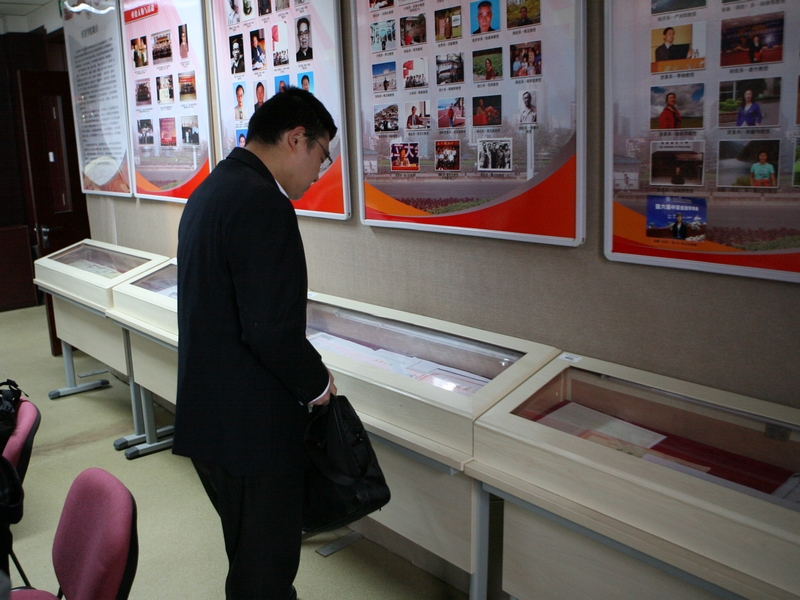 各學院也充分利用與應聘者第一次親密接觸的機會,展現學院的風采,給應聘者留下盡量深刻的印象。經濟學院在面試候場室前張貼了介紹學院發展歷程的展板。在等待面試的過程中,應聘者既可以了解學院的發展歷程,提前熟悉未來的工作環境,又有助于緩解候場時的緊張心情,小小的細節體現了工作人員的細心與貼心。