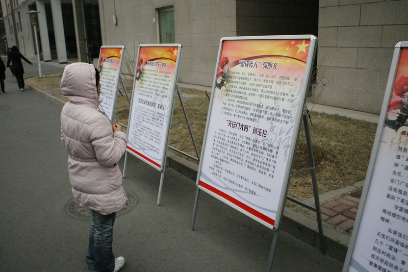為了更全面更準確地詮釋雷鋒精神,研究生部團總支成員積極籌劃,廣泛搜集資料,精心制作了詮釋不同時代雷鋒精神內涵展板共計10塊,在東區雙子樓下展出。內容從上世紀60年代,向雷鋒學習的活動席卷全國,“雷鋒”成為一切美好事物、真善美的象征。70年代,就像《學習雷鋒好榜樣》里唱的那樣,“忠于革命忠于黨,愛憎分明不忘本……”“忠誠”和“愛憎分明”備受關注。80年代,改革開放,百廢待興,“做一顆永不生銹的螺絲釘”的釘子精神,為時代推崇。到90年代,雷鋒精神被解釋為“全心全意為人民服務,為了人民事業無私奉獻”的奉獻精神。同時,還搜集展出了“當代雷鋒”——郭明義、“天安門廣場義務保潔員”——劉玉珍等同志的優秀事跡?,F場觀看的師生在全面了解雷鋒精神內涵的同時,嘴里亦不吝對雷鋒精神的溢美之詞。