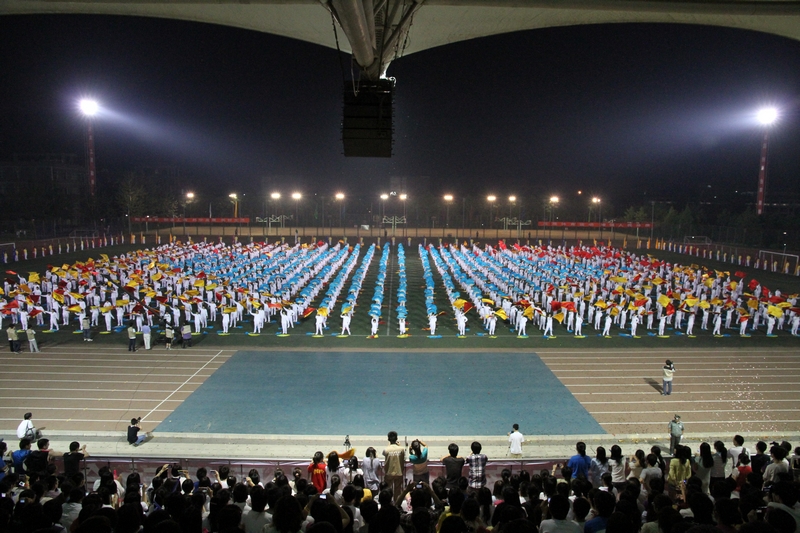 奏樂聲起,校管樂團演奏的《勇往直前進行曲》響徹全場,操場的中央,法學院的一百名學生身著黃色服裝,揮舞著各學院院旗和91個學生社團的旗幟,在燈光的照耀下,形成了一幅百旗飄揚的壯觀景象。