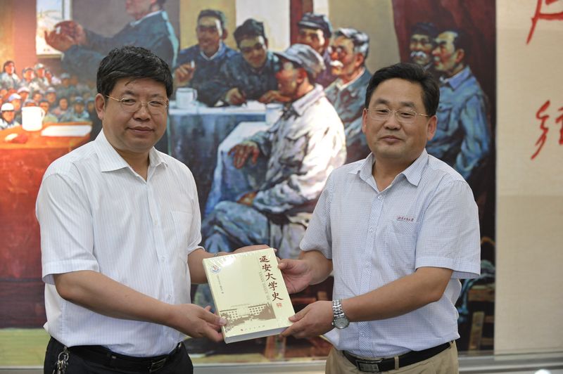 訪問延安大學期間,考察團一行聽取了由中共黨史研究專家、延安大學教授、中國延安干部學院兼職教授楊延虎所做的《中共中央在延安十三年》的報告。楊教授從延安的歷史內涵概說、黨中央在延安十三年的輝煌業績、黨在延安時期創造輝煌業績的經驗啟示等方面闡述了延安精神的偉大。張德玉副書記代表此行的青年教師感謝楊教授精彩的報告,并談了幾點感想:一是要深刻體會延安精神的精髓;二是要重溫歷史,記住歷史;三是要堅定信念,明確使命,用心體會并在今后學校發展中具體實踐延安精神。考察團一行在延安大學負責人的陪同下,參觀了延安大學校史陳列館。其間,張德玉副書記代表學校和延安大學互贈紀念品。