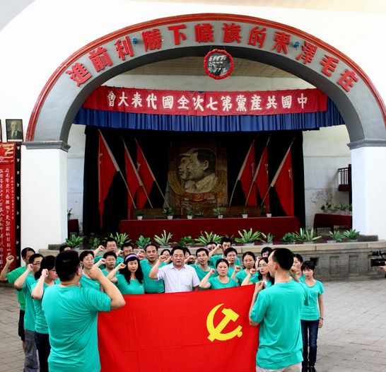 在“七大”會議舊址——楊家嶺,考察團全體成員在張德玉副書記的帶領下重溫入黨誓詞。