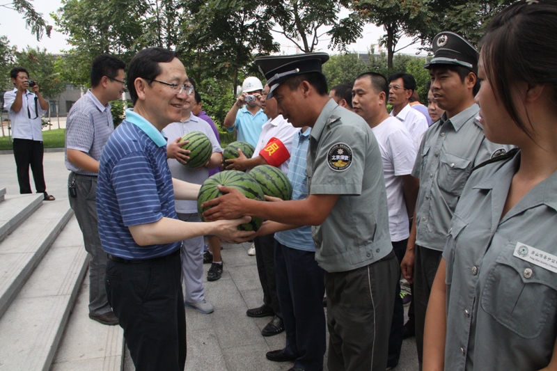 譚向勇校長代表學校黨政對后勤管理處、規劃建設處、保衛處及物業公司的同志們堅守崗位表示慰問,對大家辛勤工作表示感謝并贈送了慰問品。譚校長表示,今年暑期北京雨水比較多,學校的防汛工作應對有效,學校的基礎建設和生活區回購后的各項工作正在緊鑼密鼓的進行,他感謝大家在高溫天氣仍堅守崗位認真工作,保障假期校園水電、餐飲、學生管理、物業管理、維修、綠化等各項工作的正常運行和校園的安全穩定,希望大家繼續努力,加強工作,為新學期開學做好各項準備和保障。