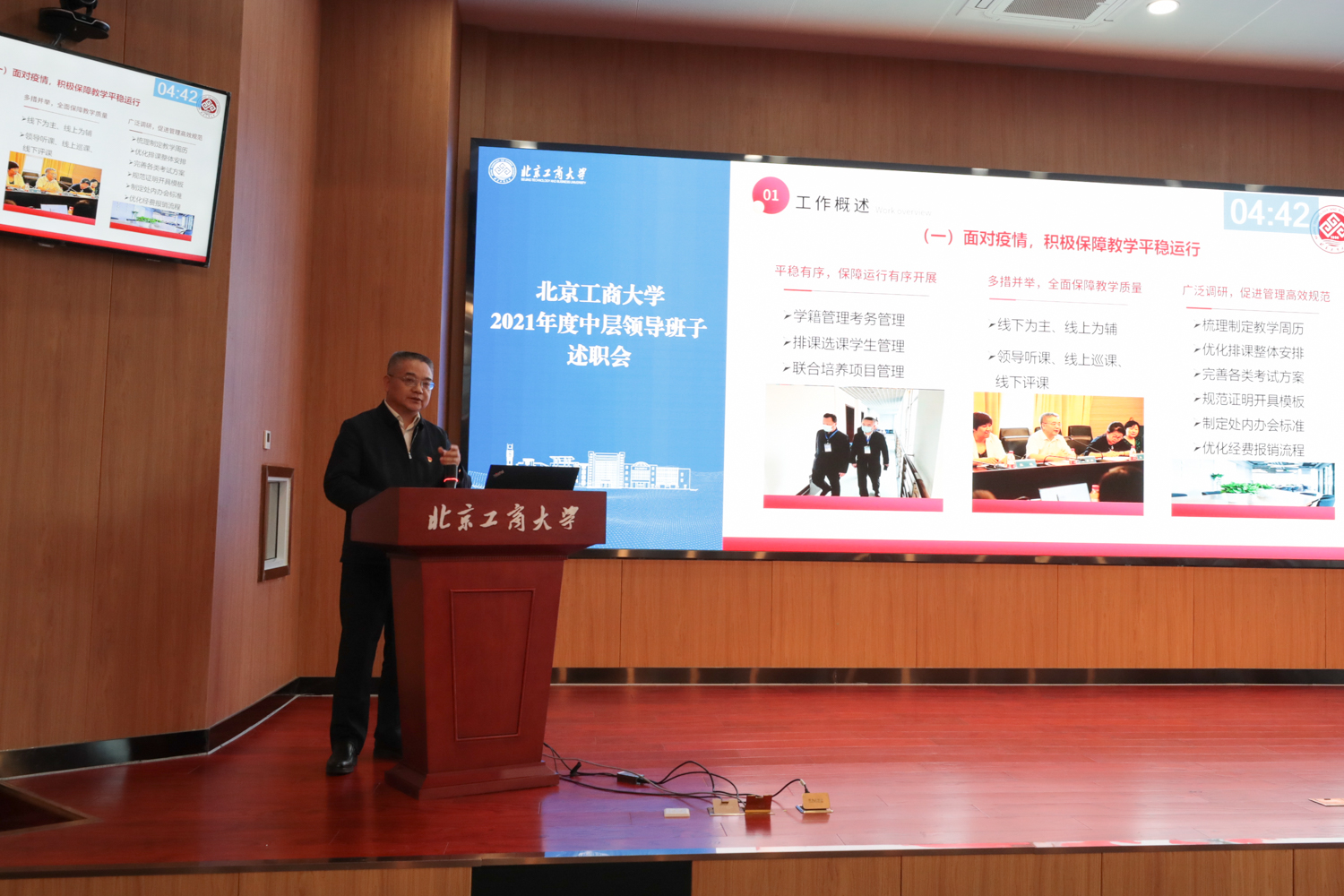 根據(jù)學校中層領導班子、中層干部考核工作安排,由各二級單位行政負責人依次代表領導班子對年度工作進行述職。43家二級單位負責人根據(jù)本單位自身職責定位,圍繞學校黨政工作要點、十大重點工作任務等內容,涵蓋黨的建設、班子自身建設、黨風廉政及作風建設等方面情況,以文稿演示形式匯報了2021年工作完成情況、存在問題,展示了取得的工作業(yè)績,并對2022年重點工作進行展望。