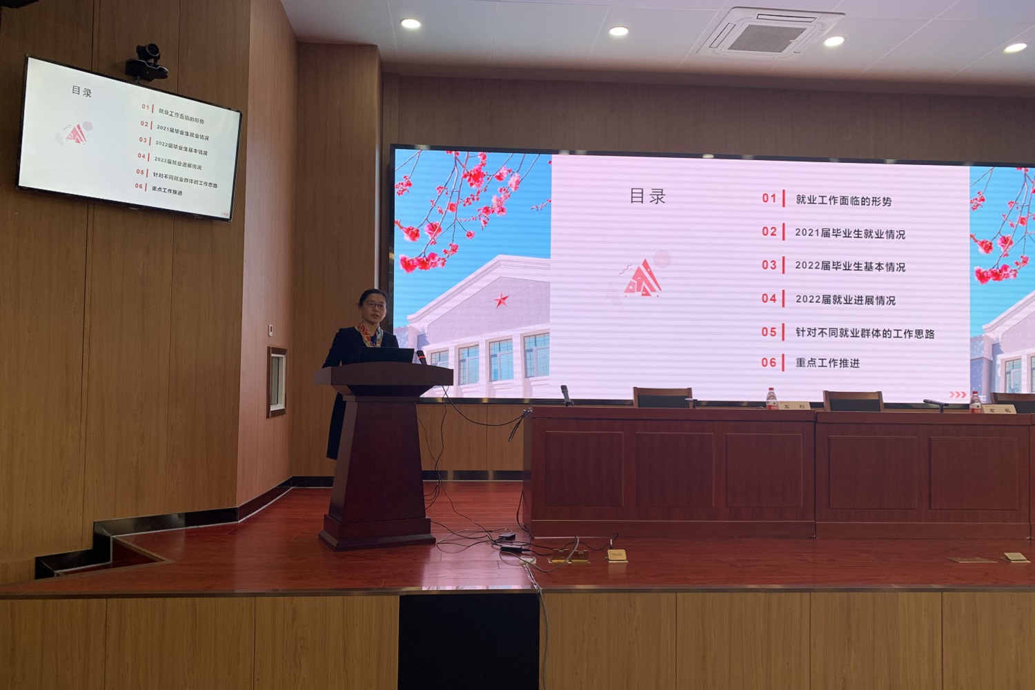 招生就業處處長楊林介紹了召開此次會議的背景和目的,并對各學院落實有關會議精神提出建議。招生就業處副處長石松從就業工作面臨形勢、2021屆畢業生就業情況、2022屆畢業生基本情況及就業進展情況、針對不同就業群體的工作思路和重點工作推進六個方面對就業工作進行部署。本科招生負責人卜曉媛從本科招生基本情況、存在問題、推進工作和工作日程四個方面對本科招生工作進行介紹。