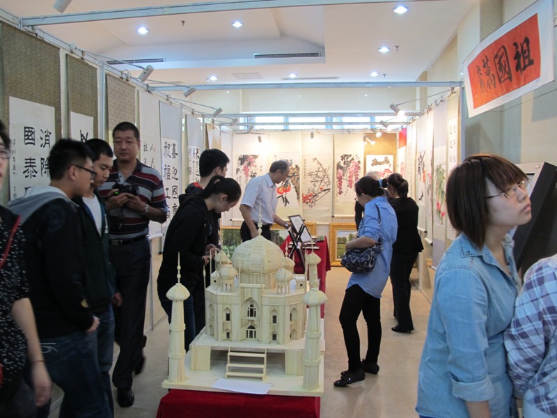 “這個創意太巧妙了!”食品學院大三的邱同學目光一接觸到工藝品《因愛而生——泰姬陵》就忍不住發出驚嘆聲。邱同學說:“居然想到用一根根小小的筷子拼成一個建筑模型,這是常人很難想到的。造型非常漂亮,充滿了濃郁的異域風情”。兩個女生也被該作品吸引,掏出手機從不同角度拍個夠。這件用1萬多根筷子組成的泰姬陵模型,由藝術設計091班學生雷華耗時一個半月獨立完成。雷華說,作品剛完成就引發了班級同學的圍觀,讓靦腆的他“很不好意思”,于是一直將愛作收藏在宿舍;這是第一次大范圍展出。