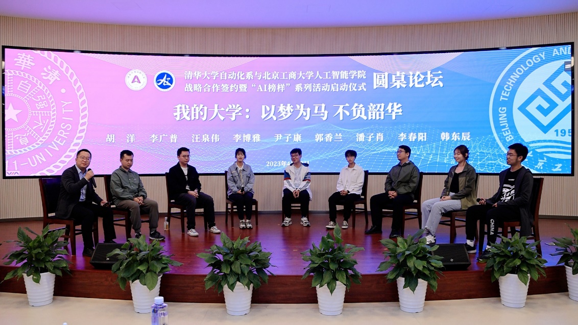 活動的最后一部分為“我的大學:以夢為馬 不負韶華”主題圓桌論壇,活動由人工智能學院團委書記胡洋主持。來自清華大學和北京工商大學的8位優秀學子圍繞“大學規劃與目標”“如何平衡學生工作與學習任務”“參與競賽的過程與收獲”“如何做好科學研究,科研報國”“如何看待ChatGPT”“大學里的遺憾”等話題進行深入探討。