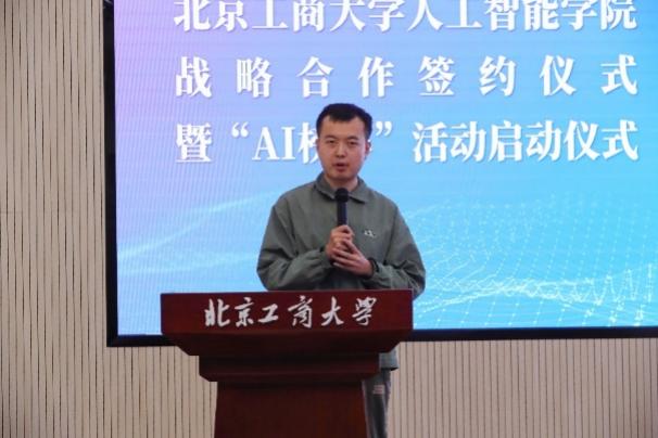 清華大學自動化系主任張濤致辭。他表示,這是他第一次走入北京工商大學良鄉主校區,欣喜的是兩校除了教師之間的交流,也逐步開展學生層面的活動。此次隨行的清華大學學生包括了系團委書記、學生骨干和科協會長等,希望可以深入交流,進一步探索合作方向。他表示,清華大學自動化系和北京工商大學人工智能學院關系緊密,目前自動化專業也逐漸將傳統控制與人工智能相結合,守正創新。相信北京工商大學人工智能學院隨著系統科學博士點的建設及博士生數量的增加,會培養出更多優秀人才,成長出更多杰出校友。他希望,未來雙方能夠一起努力,在科學研究、人才培養等方面開展更廣泛更深入的合作。