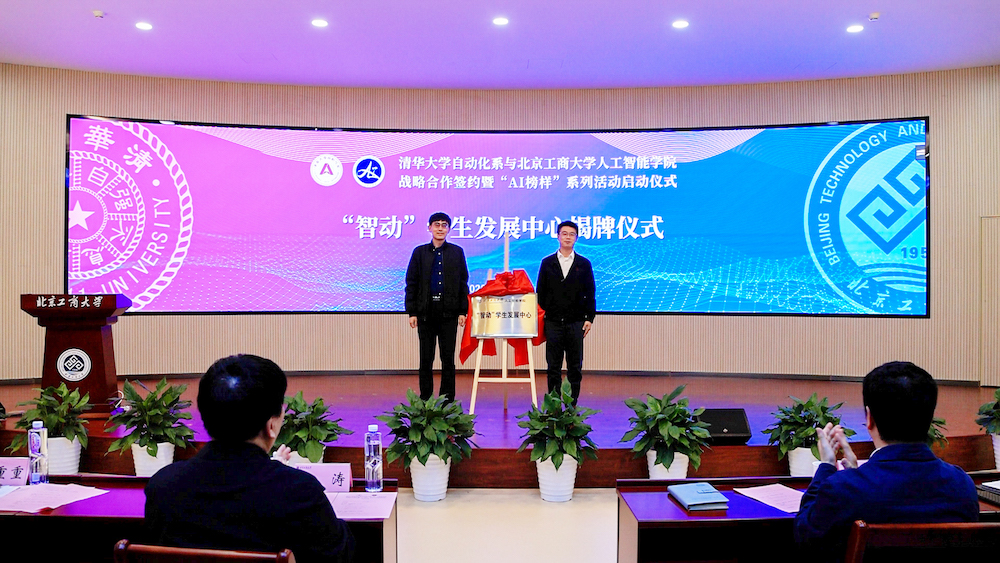 清華大學自動化系黨委副書記古槿與北京工商大學人工智能學院院長于重重進行簽約。戰略合作簽約儀式由人工智能學院黨委書記黃志剛主持。清華大學自動化系黨委學生組組長尚超與北京工商大學人工智能學院副院長李剛一同為“智動”學生發展中心揭牌。