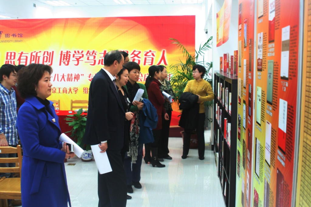 為認真貫徹落實“十八大”會議精神、熱情謳歌黨的光輝業績、加快推進學習型基層黨組織建設、引導師生多讀書、讀好書, 11月20日下午,圖書館在阜成路校區舉行了以“讀有所思、思有所創、博學篤志服務育人”為主題的“學習十八大精神”專題書展暨讀書會啟動儀式。學校黨委副書記盧思鋒、組織部部長兼機關黨委常務副書記董竹娟、宣傳部部長張春萍、學生處處長呂素香、組織部副部長兼機關黨委副書記鄭喜姣、圖書館全體共產黨員及學生代表參加了啟動儀式。儀式由圖書館黨支部書記李艷芬主持。