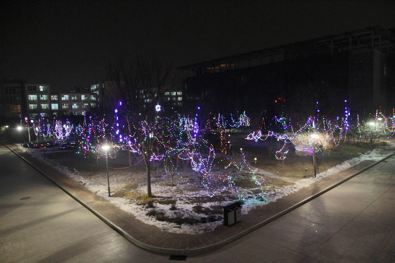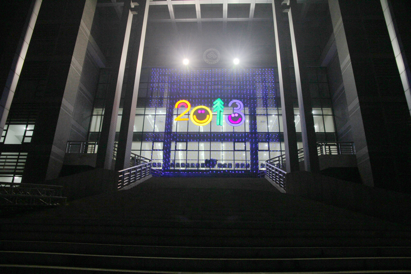 新年將至,校園里到處洋溢著歡樂喜慶的節日氣氛。樹上閃爍著五顏六色的彩燈,天橋上裝扮的彩燈和燈籠顯得格外喜慶、溫馨,“歡度新年”的紅色橫幅在學生活動中心門前鋪開,文體館前懸掛著的“2013”彩燈字樣絢麗奪目。