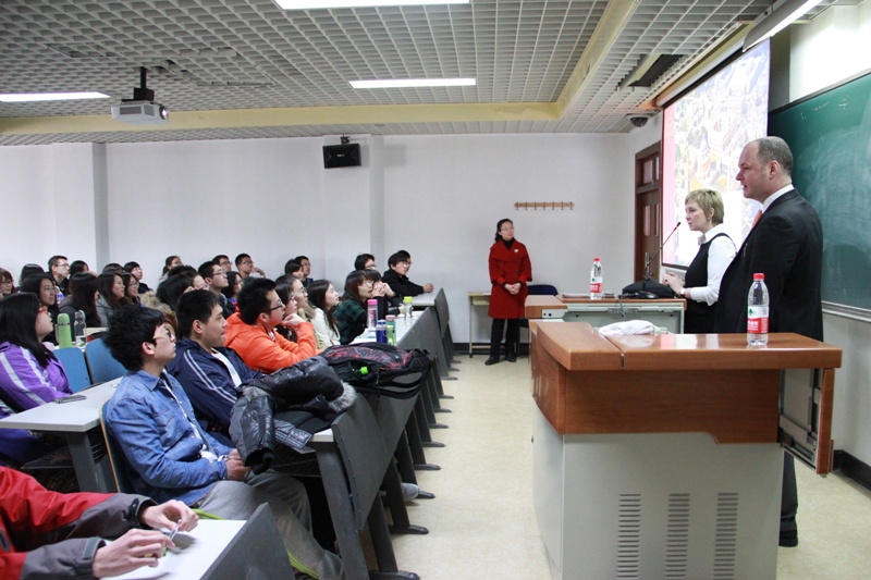 會(huì)見之前,代表團(tuán)到我校良鄉(xiāng)校區(qū)為我校學(xué)生進(jìn)行了合作項(xiàng)目的介紹。會(huì)場(chǎng)座無虛席,同學(xué)們認(rèn)真聽取項(xiàng)目介紹并踴躍提問。現(xiàn)場(chǎng)的熱烈氣氛顯示出我校學(xué)生對(duì)出國留學(xué)的極大熱情以及學(xué)生們對(duì)我校與牛津大學(xué)赫特福德學(xué)院合作項(xiàng)目的高度關(guān)注。