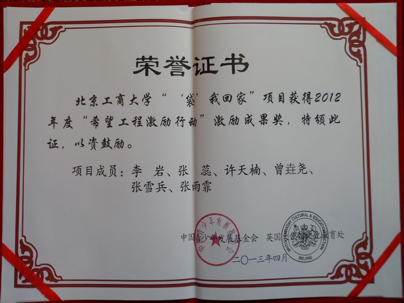 4月12日,由中國青少年發展基金會及英國大使館文化教育處聯合主辦的 “希望工程激勵行動”2012年總結分享會暨2013“希望工程激勵行動”啟動儀式在中國人民大學舉行。我校經濟學院金融102班李巖同學主持的“‘袋’我回家,把愛傳給他”項目榮獲希望工程激勵行動“激勵成果獎”,并作為優秀項目團隊的10名代表之一赴香港參加了交流學習活動。我校獲得“優秀組織獎”。