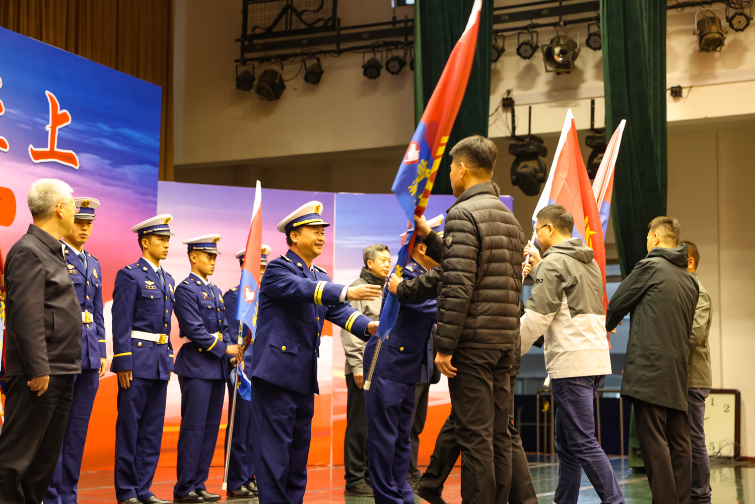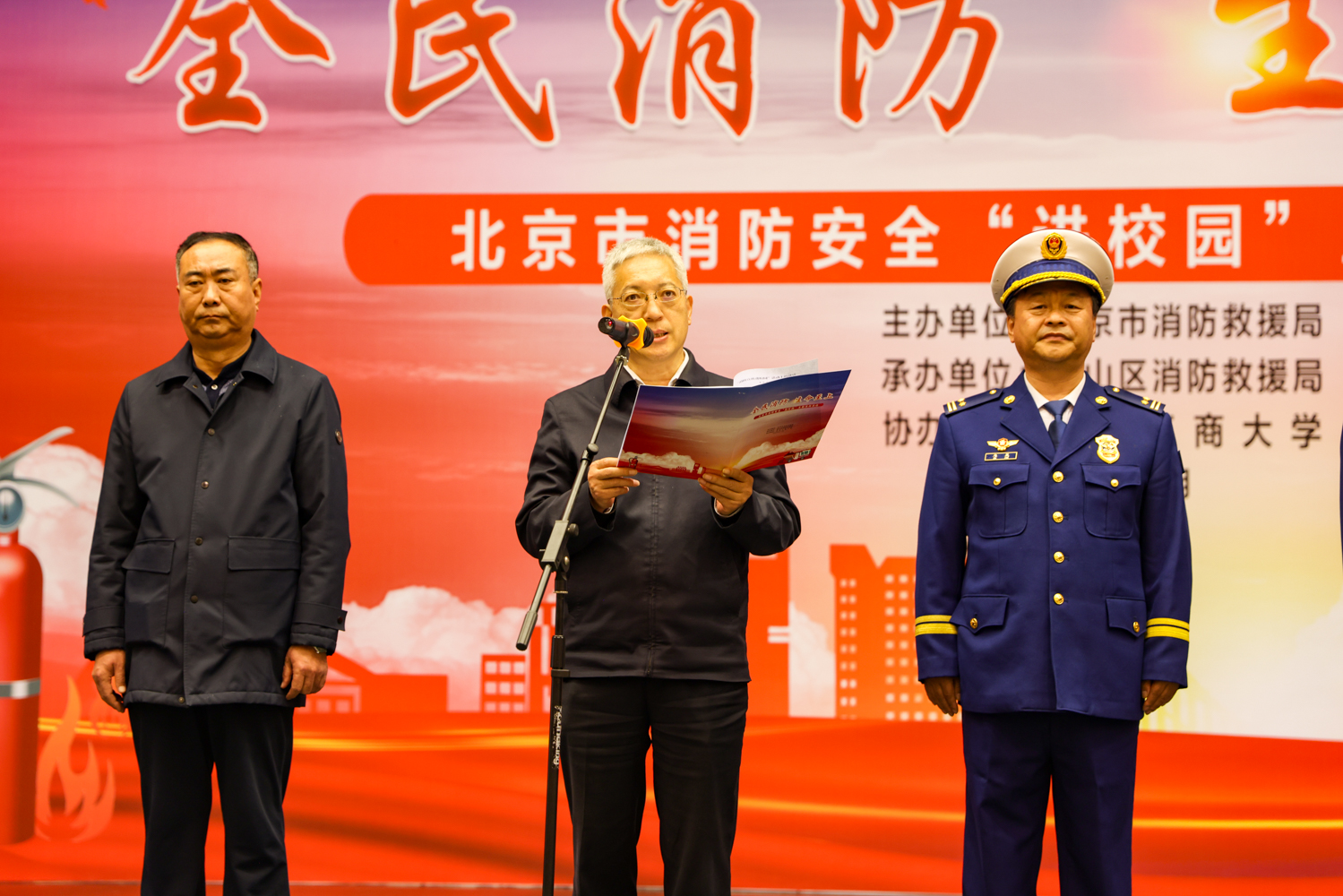 李中奇代表學校介紹了校園消防安全工作開展情況;與會領導分別為北京工商大學、北京中醫藥大學、北京理工大學、首都師范大學和中國社會科學院大學等五所大學消防志愿者服務分隊授旗,激勵各大學消防志愿服務分隊積極開展工作;北京工商大學消防志愿者代表郝樂之同學分享了自己的消防志愿服務經歷和感想,展現了同學們積極參與消防志愿服務的熱情。