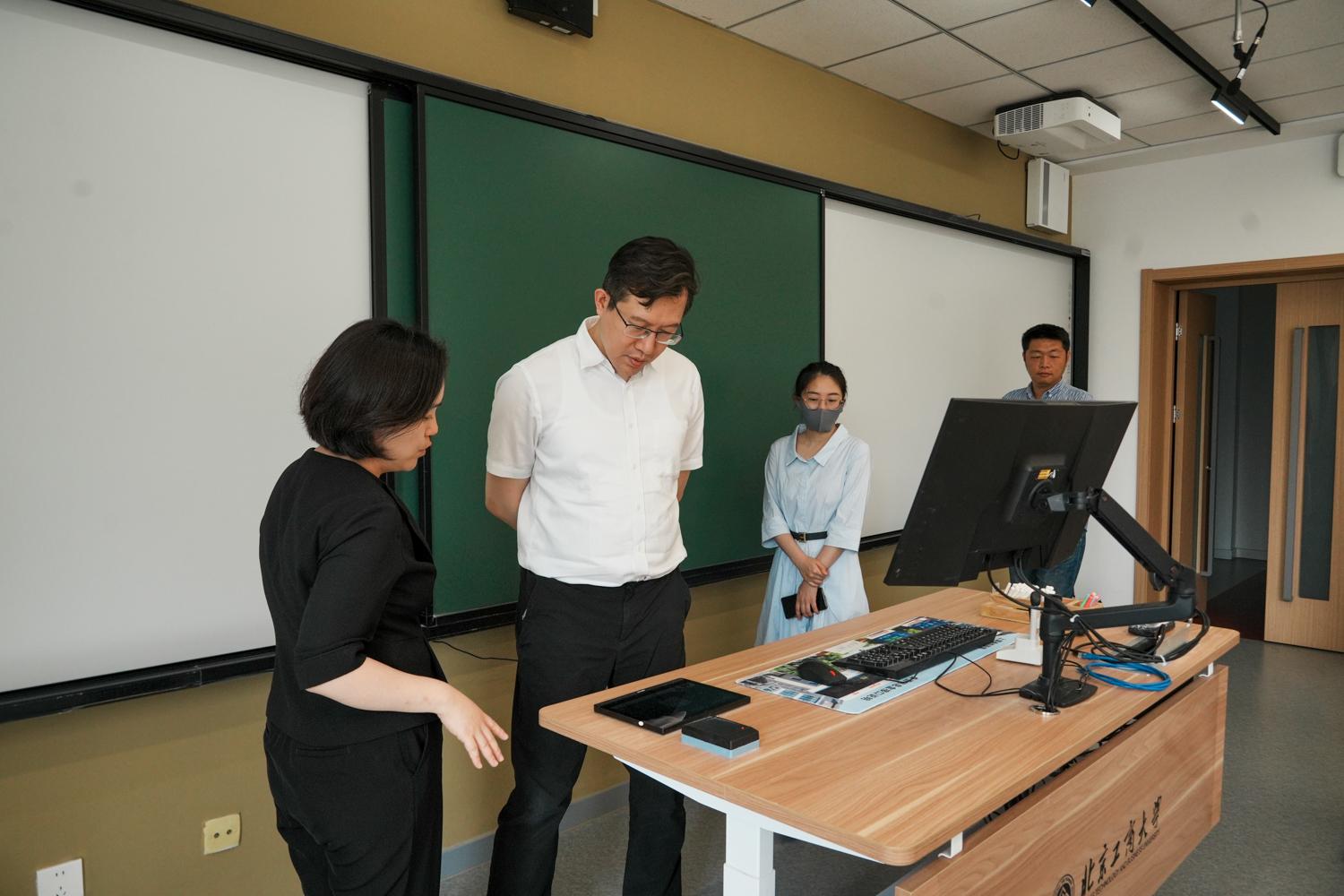 匯報會后,市教委領導和專家組一行在學校相關部門負責人的陪同下實地考察了良鄉主校區文二樓智慧教室、圖書館、學生活動中心、學生食堂和宿舍。
