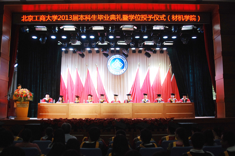 隨著莊嚴的國歌奏起,畢業典禮拉開序幕,243名畢業生身著學士服等待接受扶蘇的神圣時刻。材機學院院長黃志剛宣讀了《北京工商大學關于2013屆本科生畢業暨學士學位授予的決定》,黨總支副書記楊秀萍宣讀了表彰優秀畢業生的決定。