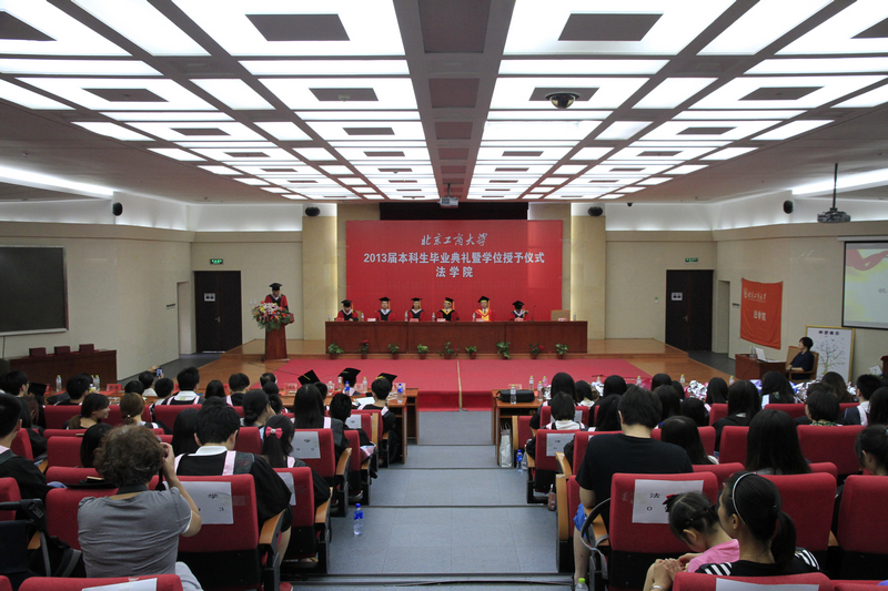 良鄉校區,21號上午10:30,法學院2013屆本科生畢業典禮暨學位授予儀式在文科實踐中心隆重舉行。校長譚向勇、黨委副書記盧思鋒出席典禮。教務處、學生處等有關部門負責人、法學院領導班子、教師代表、家長代表以及全院畢業生參加畢業典禮。