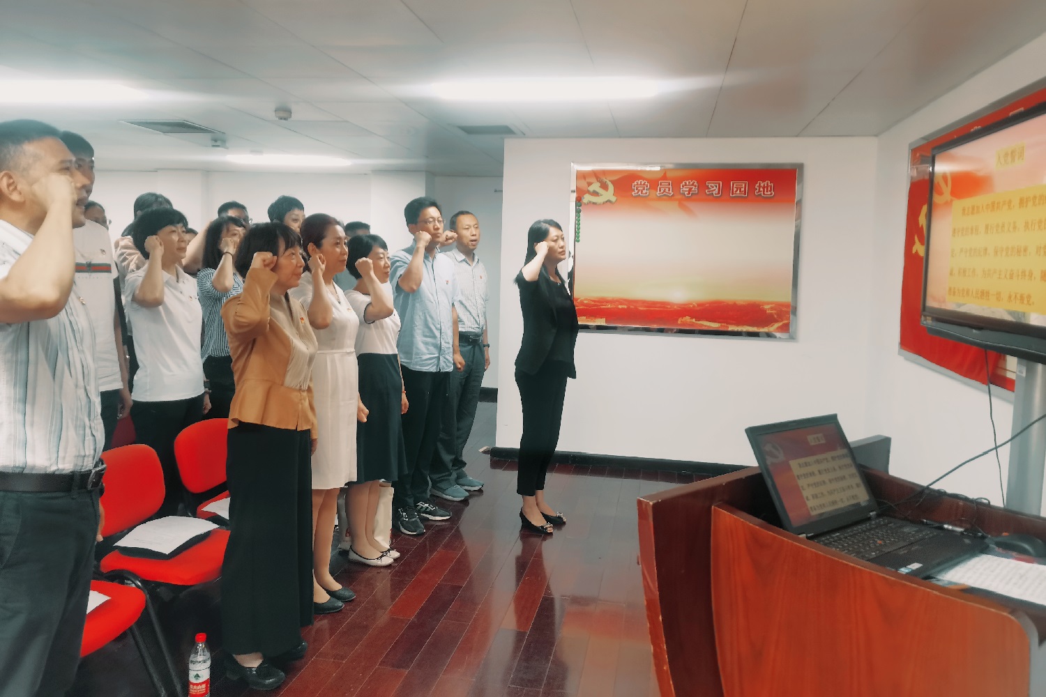 全體黨員莊嚴肅立,面向黨旗,舉起右拳,在劉萍的帶領下重溫入黨誓詞。