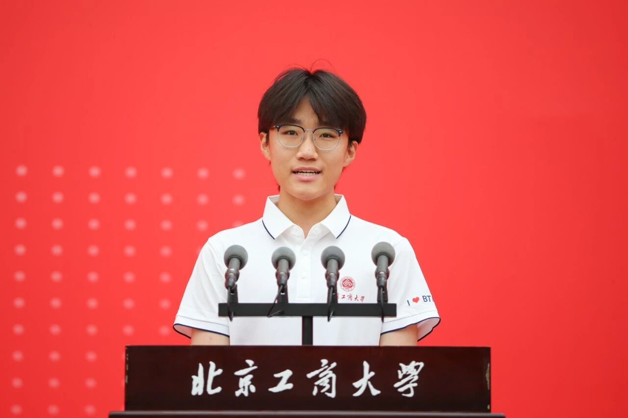 求真書院食品質量與安全實驗班耿凡稀作為新生代表發言。他以“奔赴真理、不負時代”為主題,回顧了自己被北工商“書院制”和“工商一體化”辦學特色所吸引的報考經歷,表達了對大學生活的憧憬與承諾。他表示,作為在國家強盛進程中成長起來的“05后”,既感自豪,更覺責任在肩。他倡議全體同學:要深植德善之根,恪守底線、勇擔責任;永葆求真熱忱,以嚴謹與熱愛叩響真理之門;用好首都資源,拓展視野、增長才干,努力成為具有家國情懷、創新能力和跨界思維的新時代青年。