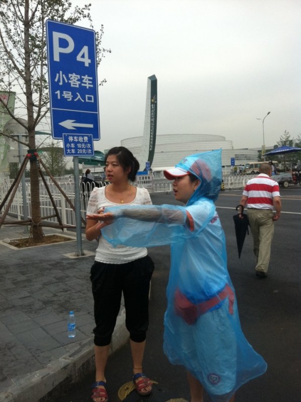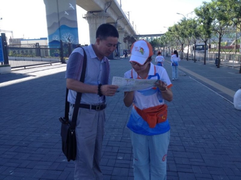 志愿者細(xì)心地為游客解答問(wèn)題 酷暑下的他們依然在熱情奉獻(xiàn)著