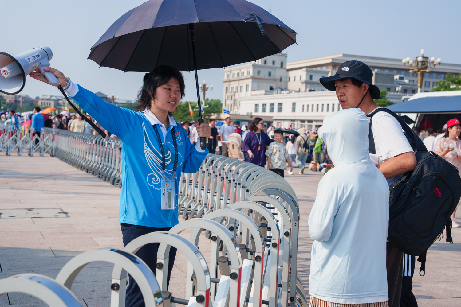 面對來自五湖四海的瞻仰群眾,他們以清晰的指引、流利的外語和溫暖的微笑服務每一位瞻仰群眾。那一聲聲親切的“謝謝”,更是化作一股股暖流,溫暖了志愿者們的心窩。志愿者張艷潔說道:“烈日下,衣服被汗浸透,我始終保持微笑,將溫馨提醒融入‘您好,請收好證件’的語言中,崗位雖小,但能把敬意傳遞出去,我就充滿驕傲。”李紅崢也談到:“這份經歷不僅鍛煉了我溝通與解決問題的能力,更讓我深刻理解到奉獻與互助的價值。微光匯聚,亦可照亮他人。它點燃了我內心的溫暖,也堅定了我繼續投身志愿服務的決心。”