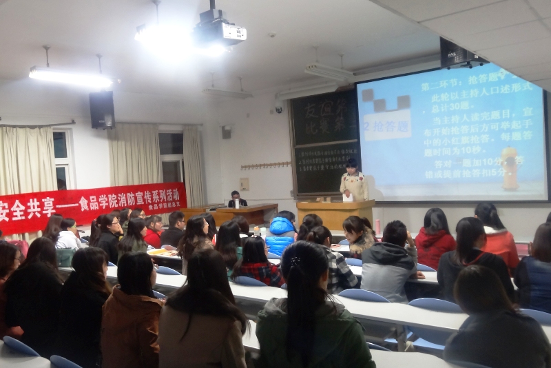11月7日,食品學(xué)院團(tuán)總支組織開展了以“心系消防,安全共享”為主題的消防知識(shí)競(jìng)賽活動(dòng)。來自食品學(xué)院2013級(jí)食品科學(xué)、生物化工、應(yīng)用化學(xué)、環(huán)境科學(xué)與工程、化學(xué)工程專業(yè)的五支代表隊(duì)共計(jì)25名研究生參賽。此次競(jìng)賽緊密圍繞《全民消防安全宣傳教育綱要》和《消防安全常識(shí)二十條》主要內(nèi)容,延續(xù)前一階段消防演練的余熱,進(jìn)一步增強(qiáng)廣大研究生對(duì)消防安全知識(shí)的學(xué)習(xí)主動(dòng)性,提高同學(xué)們對(duì)安全事故的警惕性和逃生自救能力。