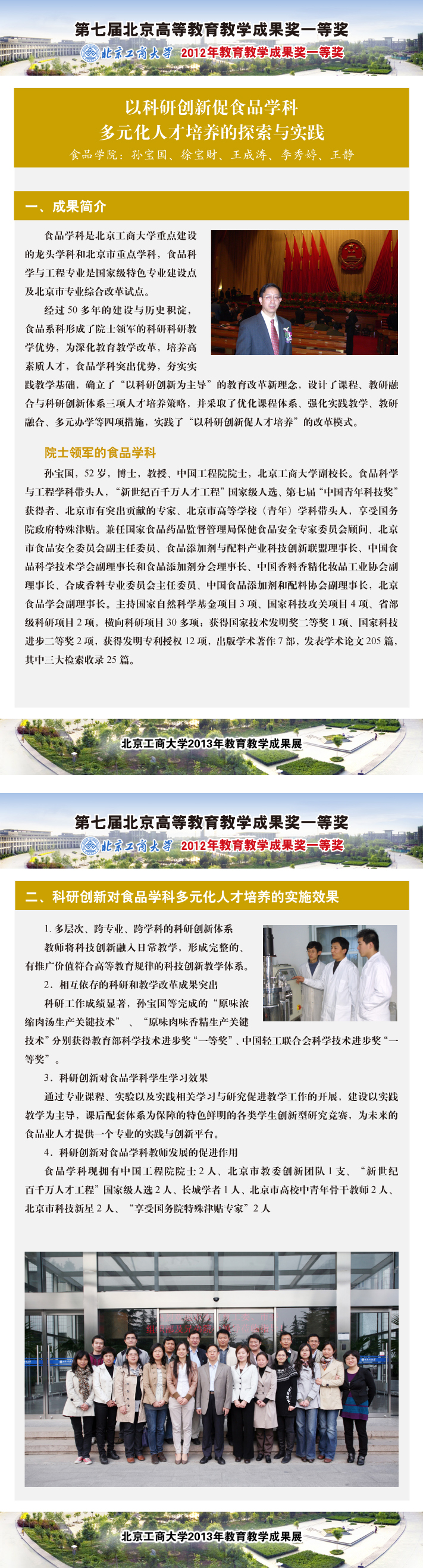 此次展出成果包括我校第七屆北京市高等教育教學成果獎獲獎成果及我校2012年教育教學成果獎一等獎獲獎成果。此次教育教學成果展匯集了我校近年來在高等教育教學和人才培養(yǎng)工作中取得的代表性突出成果,充分展示了學校、教學單位、教學團隊和教師在教育教學改革與教學建設、人才培養(yǎng)、專業(yè)建設、課程建設、實踐教學、教學管理等方面取得的成就。