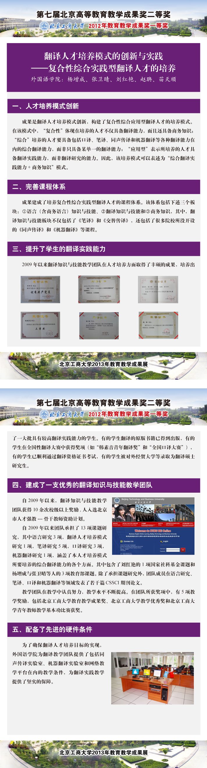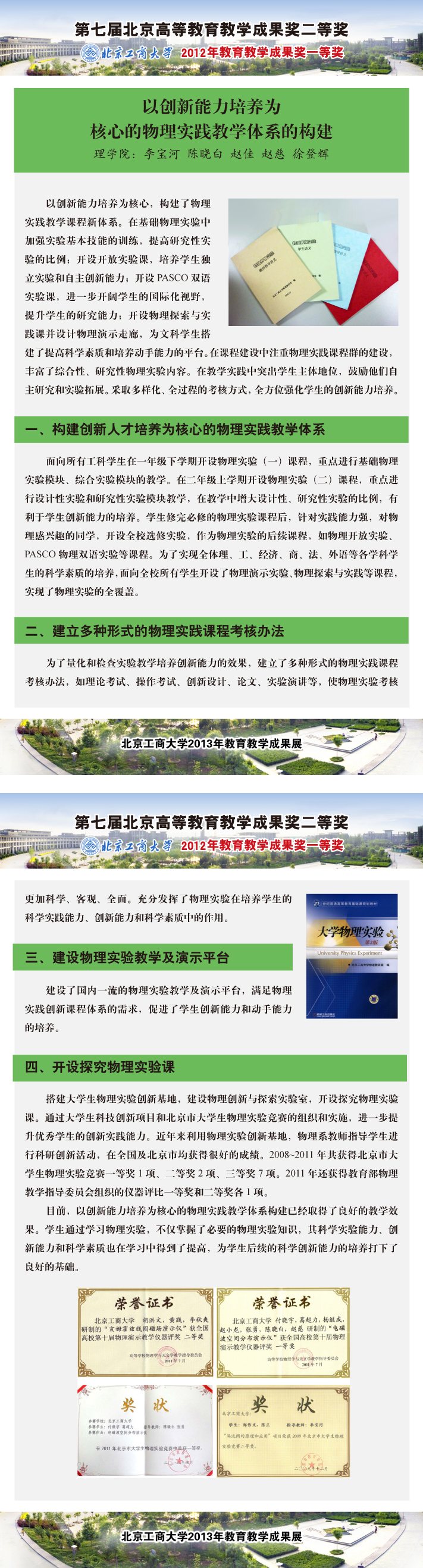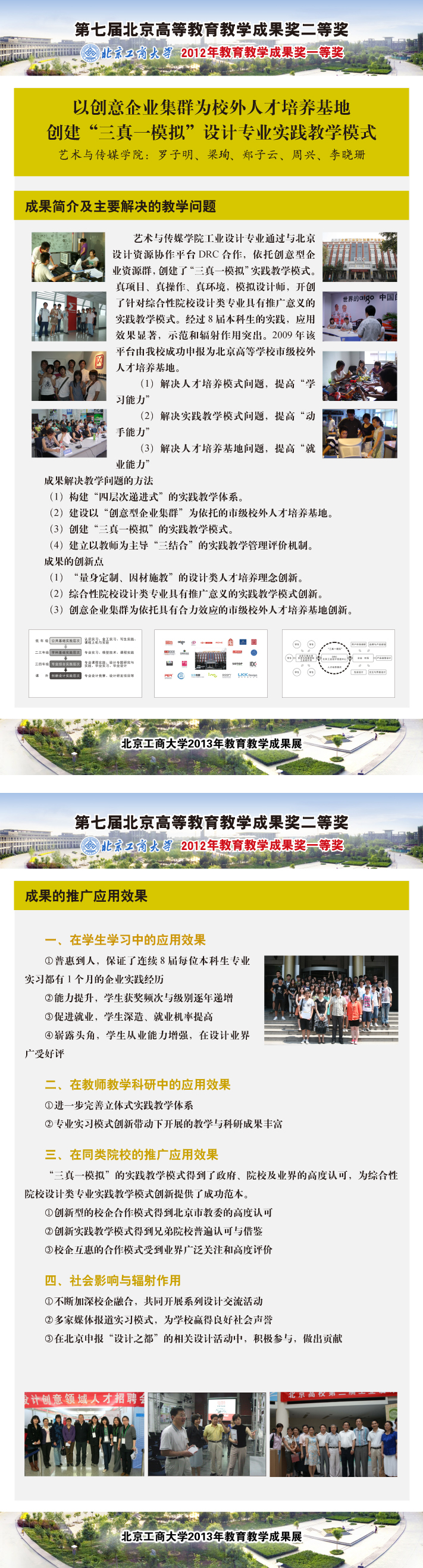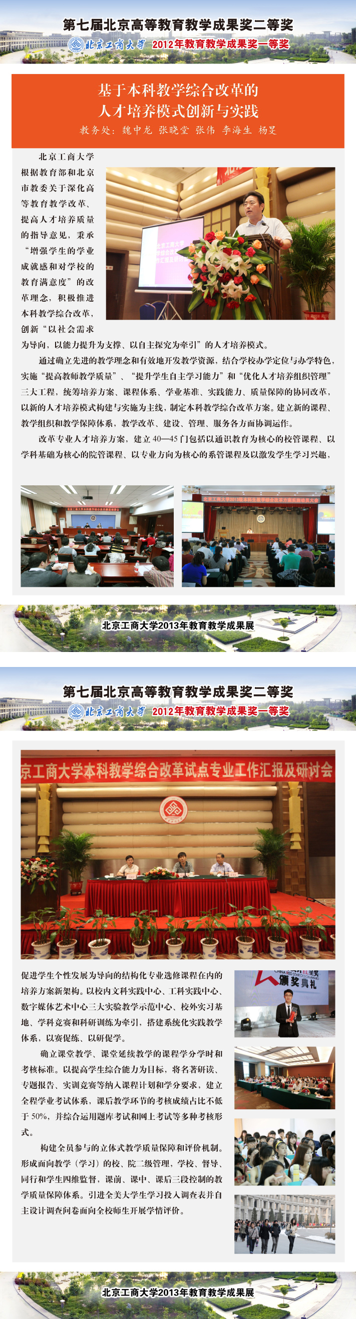 日前,《北京市教育委員會、北京市人力資源和社會保障局、北京市財政局關于表彰北京市教育教學成果獎的決定》(京教人〔2013〕18號)發(fā)布。在第七屆北京市高等教育教學成果獎評選活動中,我校共有5項成果榮獲一等獎、9項成果榮獲二等獎。根據北京市教委有關文件精神,為了更好地展示和宣傳我校教育教學和人才培養(yǎng)成果,總結本科教育教學經驗,營造良好的教學工作氛圍,學校舉辦2013年教育教學成果展,現(xiàn)進行網上展示。