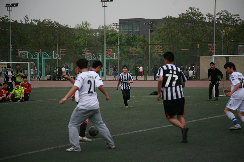 五人制足球賽的半決賽中,雙方球員進(jìn)攻猛烈,毫不示弱。雙方隊員精湛的腳法、完美的盤帶、犀利的射門以及默契的配合、縝密的隊形部署博得場邊拉拉隊的陣陣喝彩。