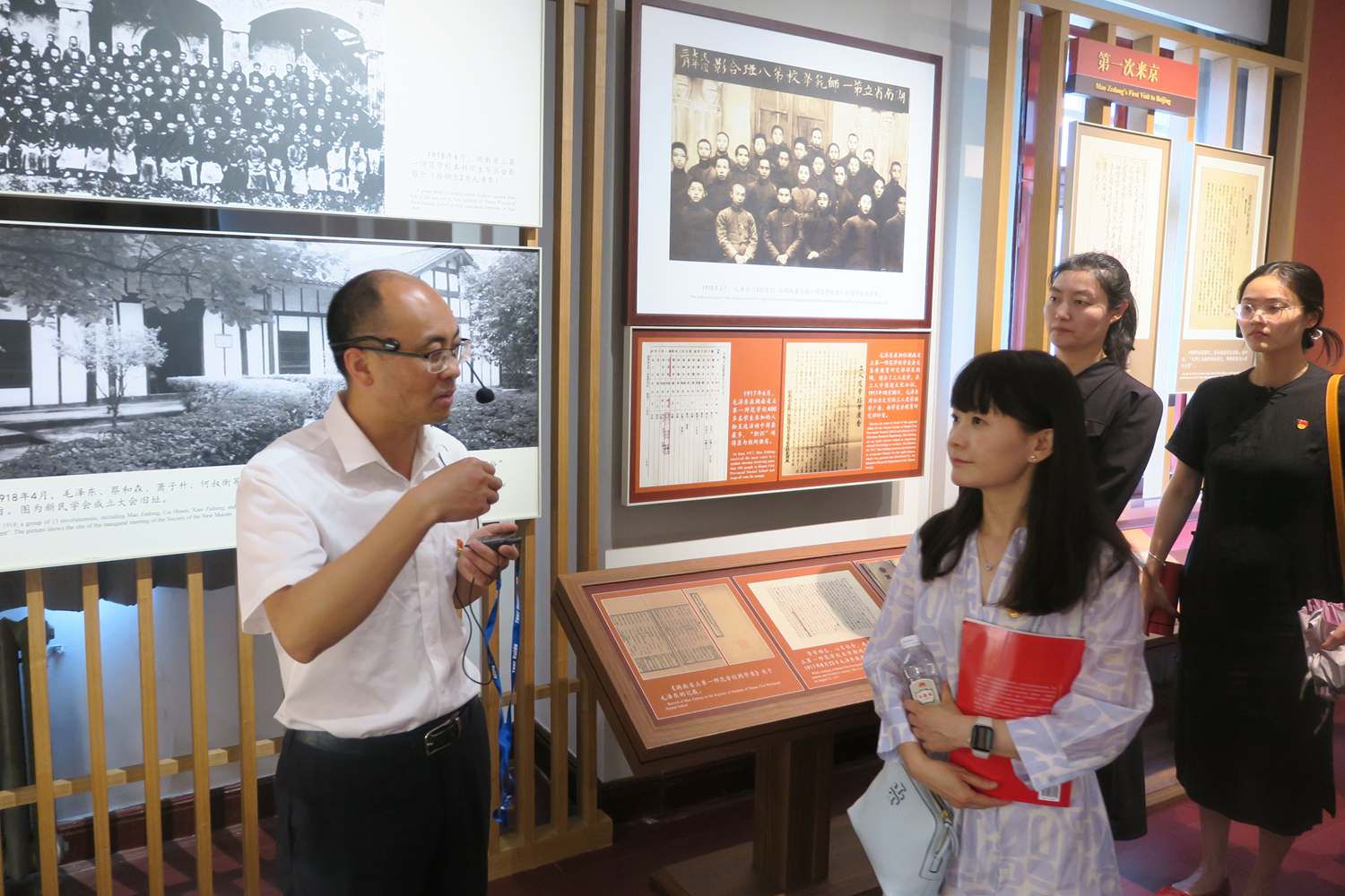 楊家毅館長站在當年李大釗授課的講臺前娓娓道來,為師生們分享青年毛澤東在北大紅樓、北大二院、楊昌濟故居、三眼井胡同、陶然亭慈悲庵、長辛店等紅色舊址開展革命活動的經歷。師生一行坐在毛澤東、鄧中夏等先驅者們曾經學習研討的座位上,仿佛穿越時空,開啟了一場穿越時空的對話。
