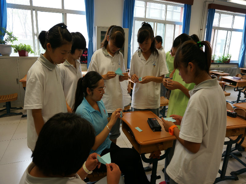 手工組的四名成員帶著工具走進(jìn)了韓村河中學(xué)的階梯教室。實(shí)踐團(tuán)成員在向同學(xué)們講解了手工折紙的由來和發(fā)展之后,便開始教他們折紙。大家分成小組進(jìn)行手工展示,各展其長,既有合作又有競爭,場面十分融洽。折紙過程中,不僅完成了既定的教學(xué)任務(wù),小同學(xué)們還擁有了自己的作品,溫婉動人的百合,嬌艷欲滴的玫瑰,色彩斑斕的蝴蝶等。同學(xué)們把他們的小小作品全部送給了實(shí)踐團(tuán)成員,這些不僅是工藝品,更是一座架在實(shí)踐團(tuán)成員和同學(xué)們之間溝通心靈的橋梁。