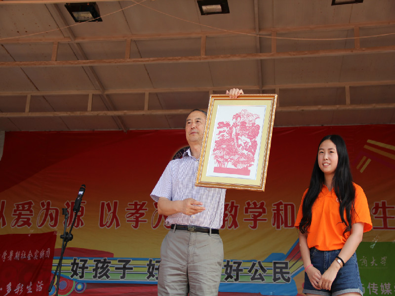 早晨,孩子們早早來到了操場,準備迎接著最后的文藝匯演。天氣炎熱,孩子們毫無怨言,認真地觀看著節目,并為精彩的演出鼓掌吶喊。在同學們演唱班歌《年輕的戰場》之時,學校黨委副書記盧思鋒,藝傳學院黨總支書記秦巍、總支副書記楊艷萍以及學校相關部門負責人來到操場親切慰問藝傳學院實踐分團的同學們。盧思鋒副書記表示,這些孩子不僅有韌性,還有耐性,是充滿希望的下一代。在接受藝傳學院贈送剪紙時他還指出,上一次藝傳學院來到張坊支教還是2006年,在支教過程中大學生應該收獲使命感和責任感,展現自己的才華,在實踐中檢驗知識,要幫助張坊中學的學生立下志向、開拓眼界,實現理想。并希望與張坊中學長期開展合作,實現互利共贏。盧思鋒副書記一行離開之時,駐足觀看了張坊中學宣傳欄中有關“孝”的文章,對同學們的學習成果表示肯定和贊賞。