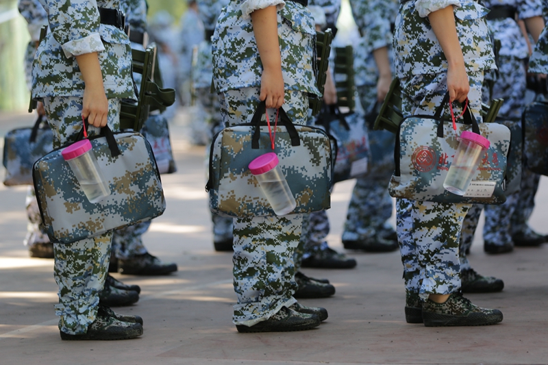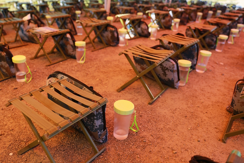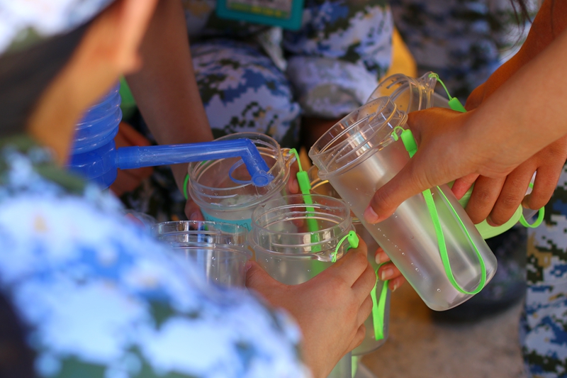 訓(xùn)練場上,太空杯整齊的排列在馬扎的旁邊。一到休息時間,軍訓(xùn)新生們便每人手提著一只相同款式、顏色各異的太空杯來到接水處,排著整齊的隊伍接水、喝水。小小太空杯起到了大作用。