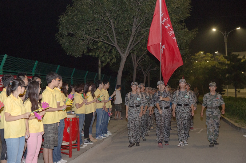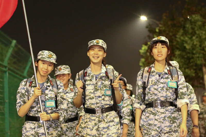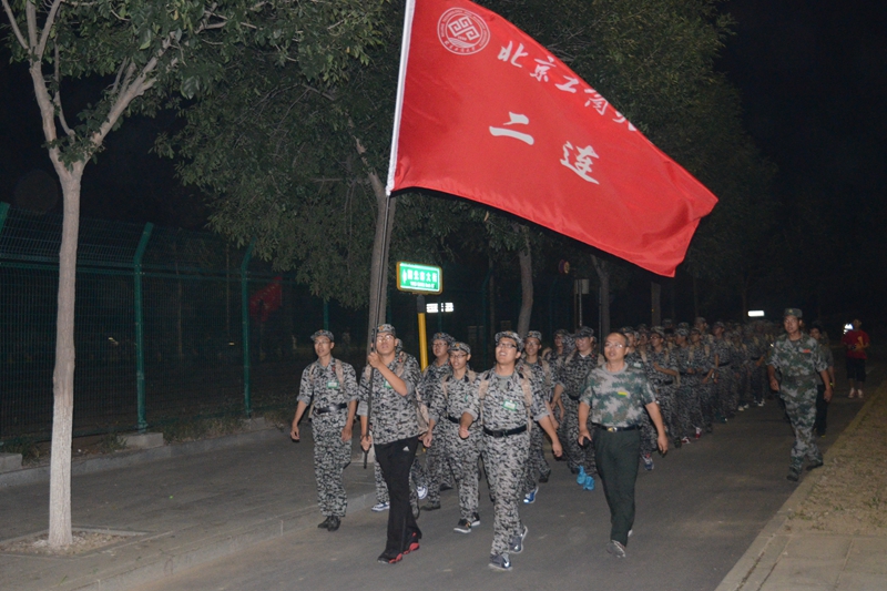 “一二一……”在嘹亮的口號(hào)聲中,男生們雄赳赳氣昂昂地踏上了6公里的征程。在整個(gè)隊(duì)列的前面,一面標(biāo)有“北京工商大學(xué)軍訓(xùn)團(tuán)”的大旗迎風(fēng)飄揚(yáng),首排的男生互相照顧,輪流舉著營(yíng)旗、連旗,帶領(lǐng)著整個(gè)隊(duì)伍奮力前進(jìn)。“這是我第一次參加拉練,我背著薄被,感覺很輕松。欣賞夜景也是不錯(cuò)啊。”一營(yíng)一連二班的林啟栓興奮地說道。中途,雄壯的《好漢歌》吸引了同學(xué)們的注意力,充滿了男子漢氣魄的歌聲激發(fā)了大家的豪邁情感。他們邁著矯健的步伐,更加堅(jiān)定地向著目的地前進(jìn)。